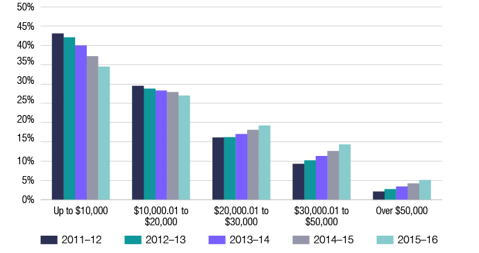 Chart 10: Proportion of HELP debtors by size of debt, 2011–12 to 2015–16 financial years