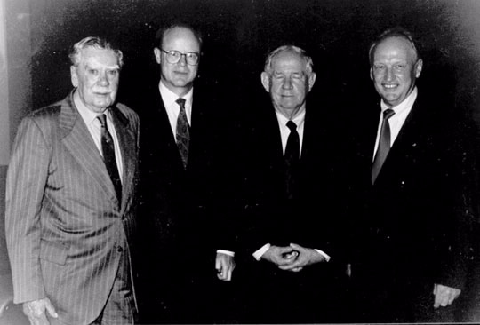 Living links with the past, four Commissioners of Taxation around 2000. Left to right: Sir Edward Cain, Michael Carmody, Bill O'Reilly and Trevor Boucher. Between them they had held stewardship of the Australian taxation system for more than 25 years and had a memory of the ATO from the 1930s.