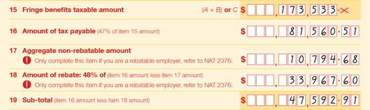 The aggregate non-rebatable amount is the part of the taxable value of fringe benefits you cannot obtain a rebate for, calculated at item 17.