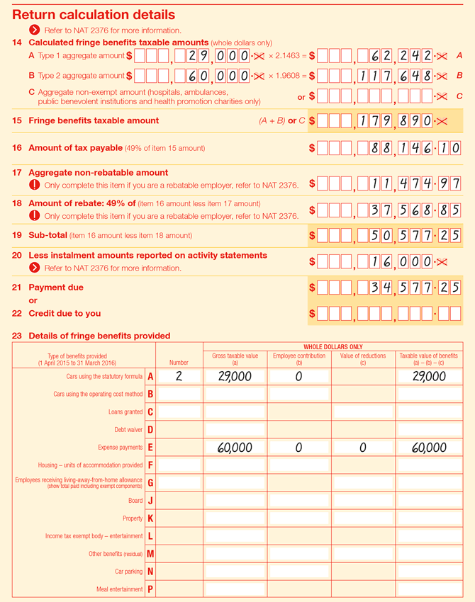 This is an example of the return calculation details of a completed 2016 FBT return. The figures used are from previous examples. You must show the exact amount of cents on the return – however, you may round down your payment to the nearest multiple of five cents.