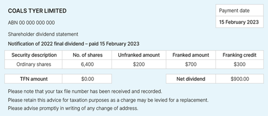 On 15 February 2024, an Australian resident company Coals Tyer Ltd paid John, a resident individual, a fully franked dividend of $700 and an unfranked dividend of $200. John received the dividend statement from Coals Tyer Ltd (see example 3).