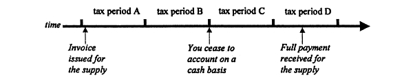 In tax period A in the following diagram, you issue an invoice for a supply that you made, but you receive no payment for the supply until tax period D. However, you cease to account on a cash basis at the start of tax period C (which is therefore the transition tax period).